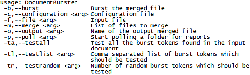 documentburster.bat –f <pathOfTheFileToBurst> [-c